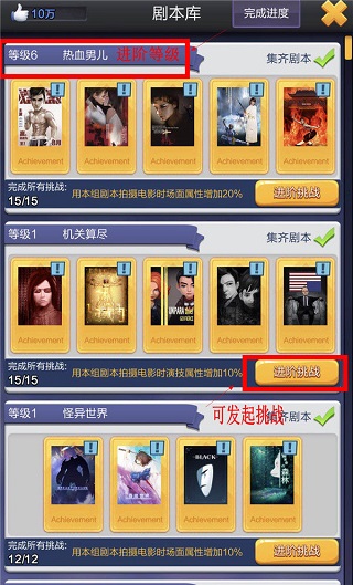 從上圖能夠了解到,只有當(dāng)一排劇本全部獲取且都完成“鍍金”操作后,我們才能開啟劇本挑戰(zhàn),而且此時劇本挑戰(zhàn)帶來的額外效果加成是覆蓋這一排里所有劇本的。每次完成劇本挑戰(zhàn),都會讓原本的拍攝屬性加成提高1%,等級也會相應(yīng)提升1級(該提升會隨著等級的提高而有所變動)。