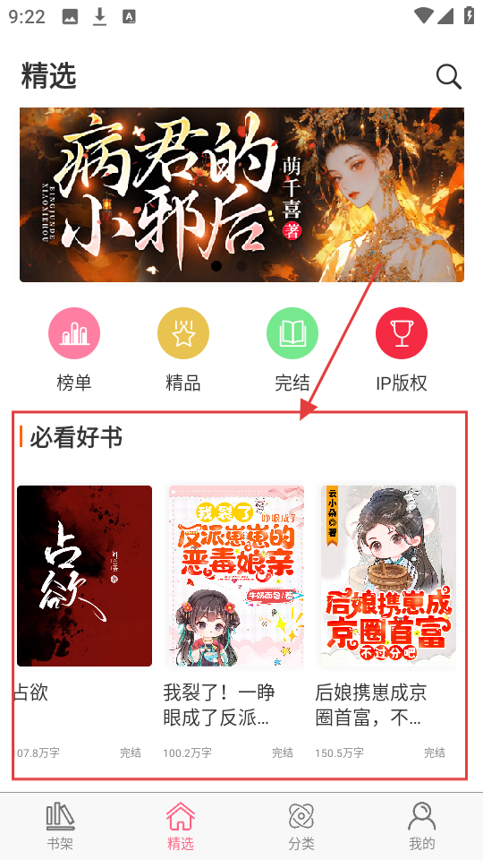 在軟件的精選頁面里,有一個“必看好書”板塊,點擊其中的書籍,就能進入書籍詳情頁,查看書籍的相關信息了。