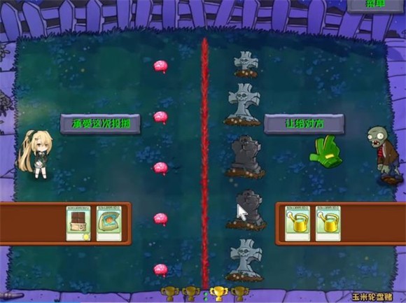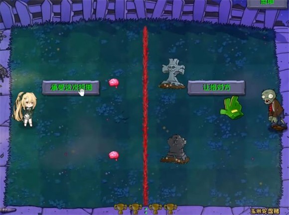 2、當玉米娘扔完所有子彈后,就會進入下一輪。選擇承受這次投擲就是給自己,讓給對方則是給僵尸。獲得兩次勝利即可通關。
