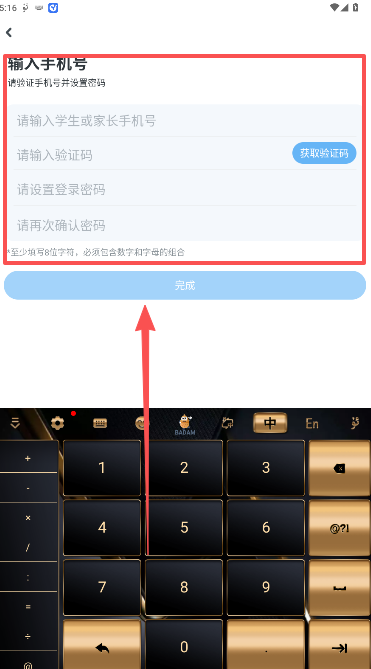 請繼續完成當前頁面的信息填寫,輸入家長手機號碼并進行短信驗證,之后點擊完成按鈕。