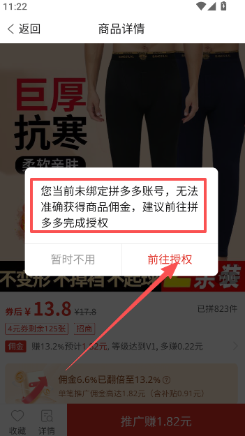 進(jìn)入商品詳情頁(yè)面后,會(huì)看到相關(guān)說(shuō)明提示,需先授權(quán)綁定拼多多賬號(hào),完成綁定后,后續(xù)下單購(gòu)買(mǎi)該商品才能獲得對(duì)應(yīng)的傭金獎(jiǎng)勵(lì)。