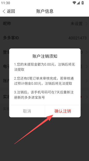 選擇確認(rèn)注銷(xiāo)完成賬戶注銷(xiāo)操作。