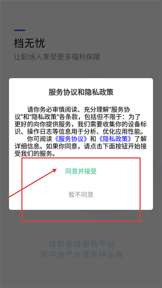 首次使用檔無憂時,需要點擊【同意并接受】按鈕,在同意《服務協議》與《隱私政策》之后,才能正常使用該軟件的各項功能。