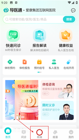 在導醫通首頁,點擊底部的【商城】圖標,即可進入健康自營商城頁面。