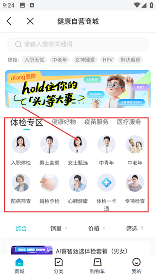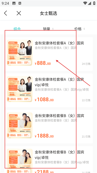 在健康自營商城的體檢專區,挑選所需項目,例如【女士甄選】分類,即可進入女士體檢套餐列表頁面。