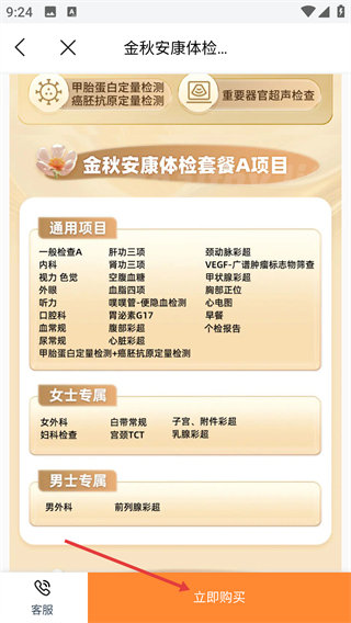 在體檢套餐詳情頁面,確認好所選項目后,點擊頁面底部的【立即購買】按鈕,就能完成該體檢套餐的購買流程了。