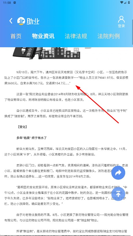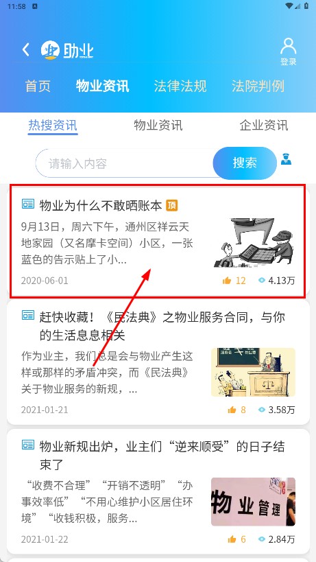 在物業資訊頁面挑選你感興趣的資訊內容,比如【物業為什么不敢曬賬本-資訊標題】這一條,然后點擊查看具體的資訊詳情。