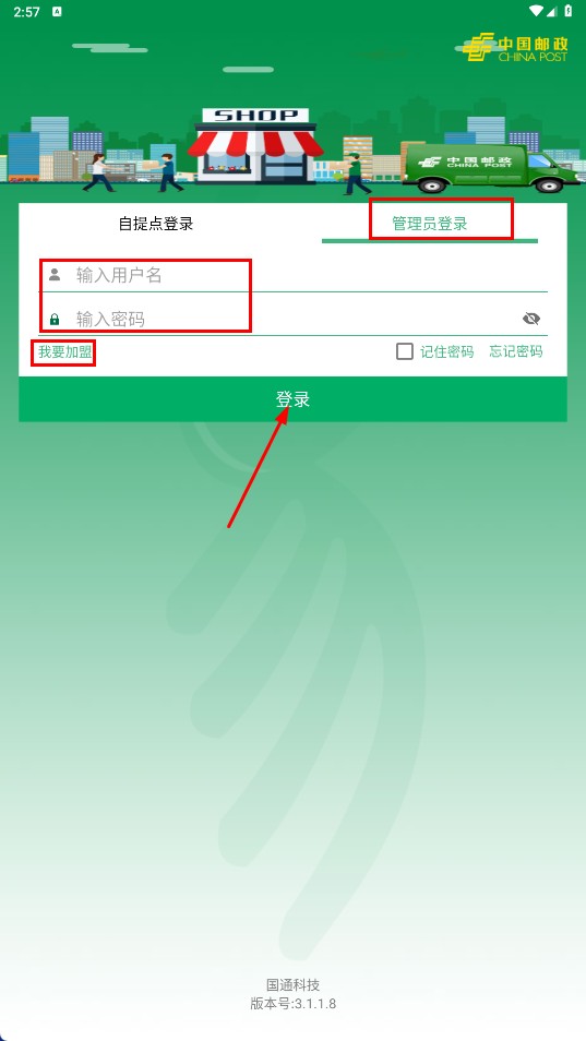 請選擇【自提點登錄-登錄方式】,輸入自提點編號或手機號以及對應(yīng)的密碼,然后點擊登錄按鈕即可完成登錄操作。