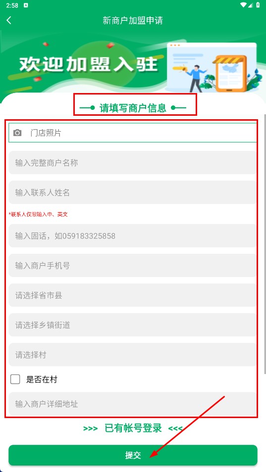 點擊【我要加盟】功能按鈕,進入新商戶加盟申請頁面,在該頁面填寫商戶信息后,點擊【提交】功能按鈕,即可完成加盟申請。