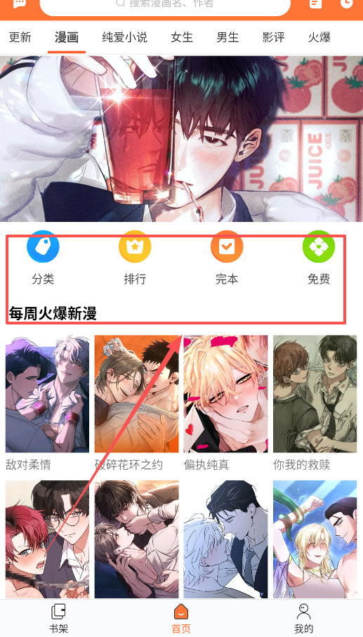 進入首頁后,可借助頂部的“更新”“排行”等分類篩選漫畫,查看每周熱門新漫推薦,點擊心儀的封面即可開啟閱讀。