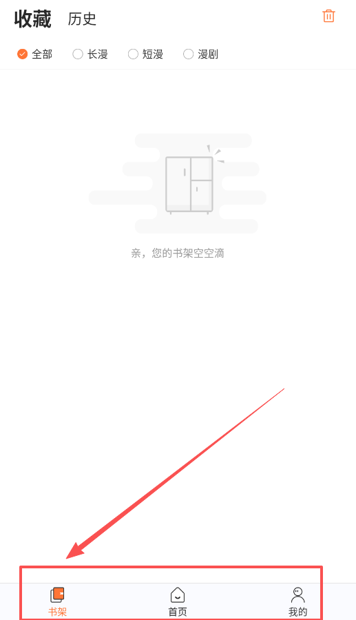 若想管理自己的內容,可點擊底部的“我的”,在這里能查看收藏夾與歷史記錄,還能把喜愛的漫畫添加到書架中,這樣下次閱讀時就會更便捷。