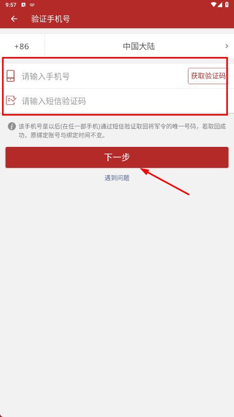 在手機號驗證頁面,先輸入手機號并獲取驗證碼,待驗證碼輸入完成后,點擊【下一步】功能按鈕。