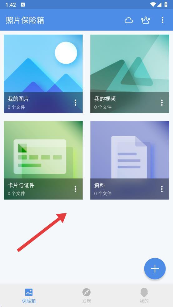 進入照片保險箱主界面后,你可以通過“我的圖片”“我的視頻”“卡片與證件”“資料”這些功能模塊,對不同類型的文件進行管理。