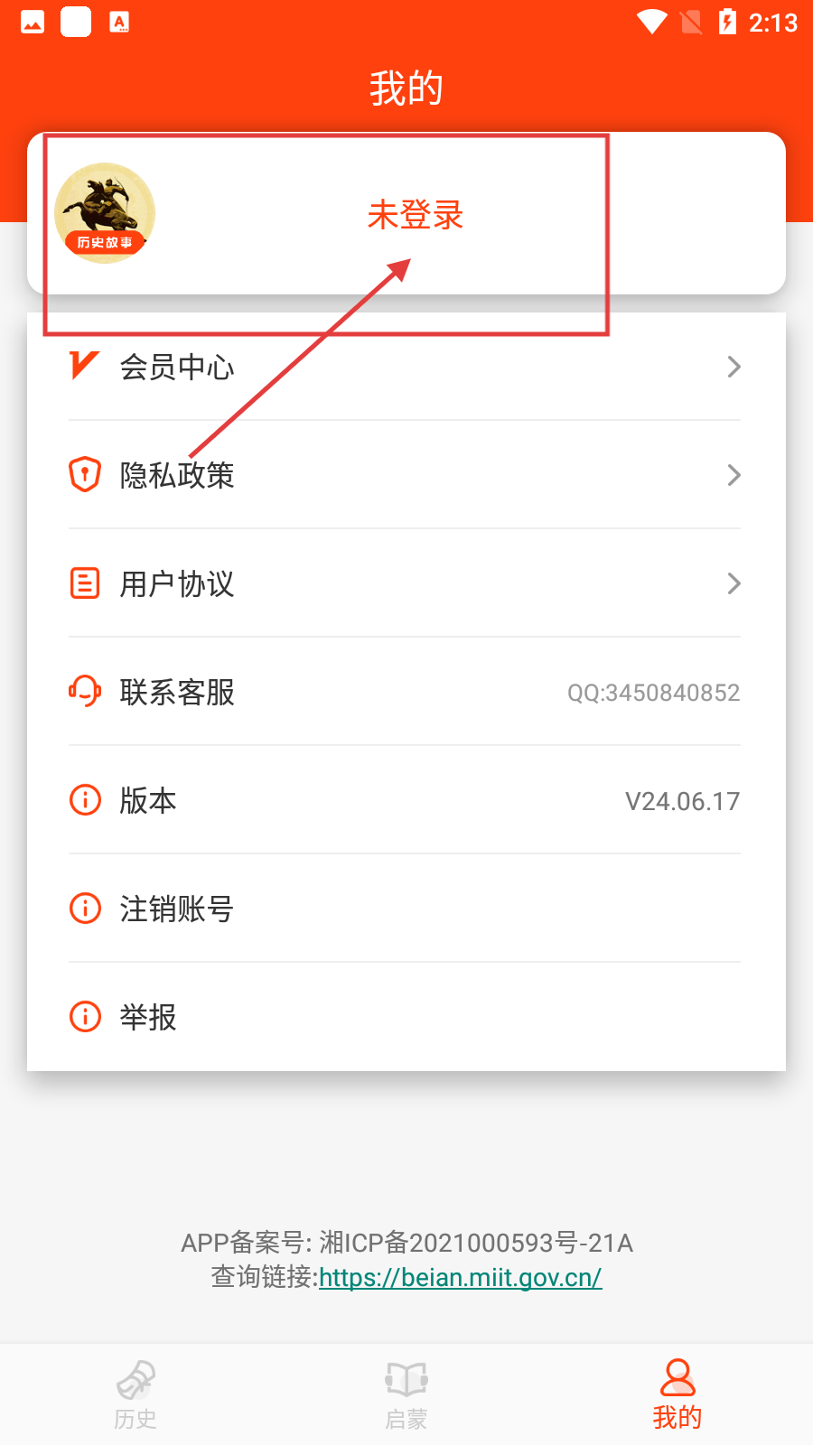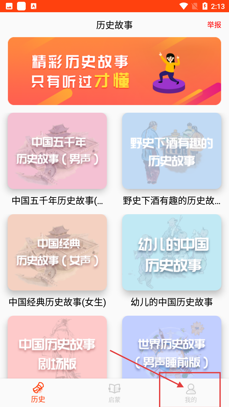 打開歷史故事應用后,在主界面能夠瀏覽到各類歷史故事的分類內容;要是想進入個人中心,只需點擊右下角的【我的】按鈕就行。