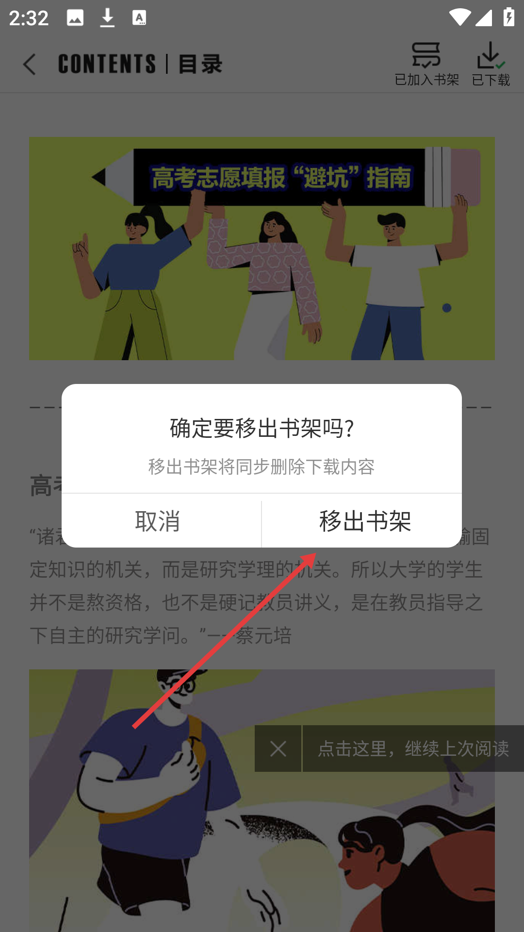 在期刊目錄頁面點擊右上角的【已加入書架】圖標,會彈出移出書架的確認框。