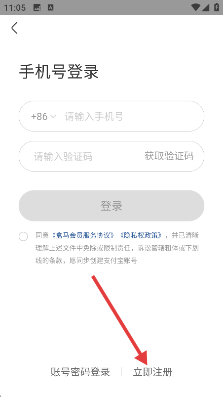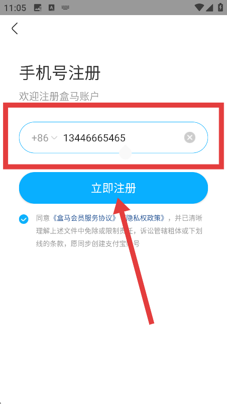 在手機號注冊頁面,先填寫手機號,接著勾選同意相關協議,之后點擊【立即注冊】按鈕。