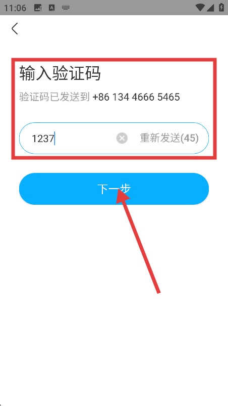在驗證碼頁面,輸入手機收到的驗證碼,然后點擊【下一步】按鈕,即可完成注冊登錄流程。
