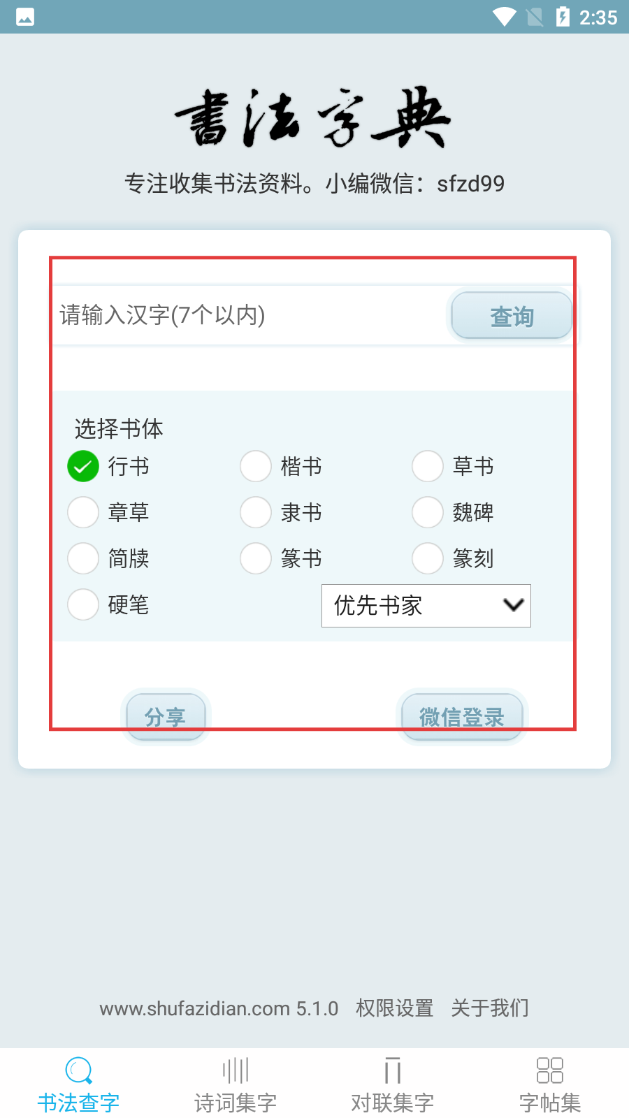 在【書法字典】的輸入框里輸入不超過7個漢字,挑選好書體(像行書、楷書這類),再點擊【查詢】按鈕。
