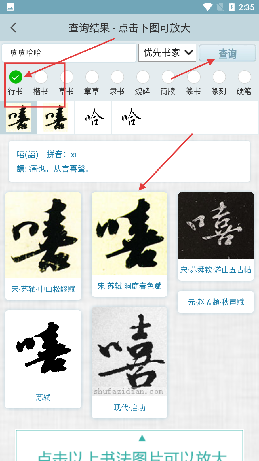 在完成查詢并進入結果頁面后,你可以選擇具體的書體(例如行書),以此查看該種書體下各個漢字的書法書寫形式,點擊對應的圖片還能進行放大查看。