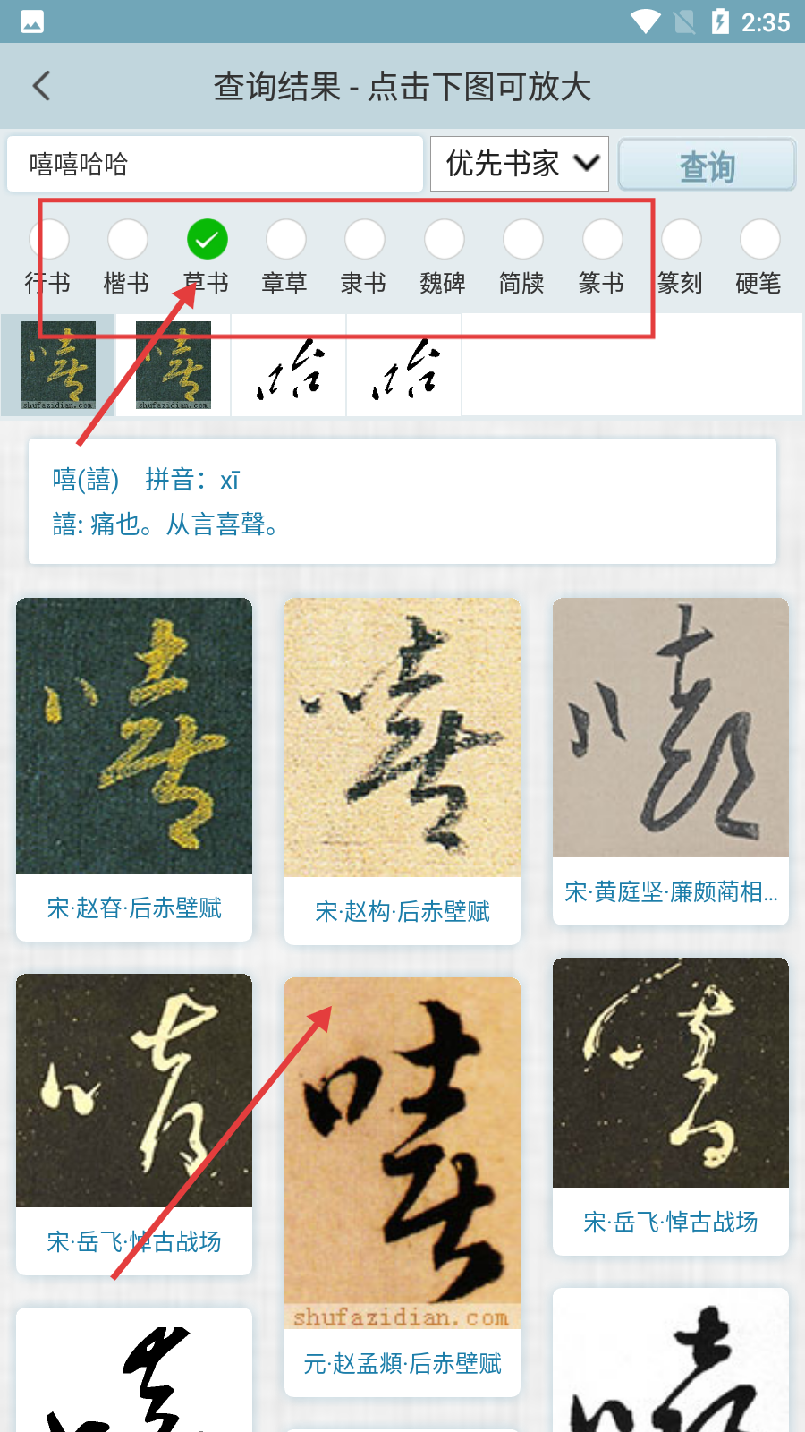 在查詢結果頁面切換書體(例如草書),就能看到該漢字在草書中的各類書法作品寫法,方便進行對比學習。