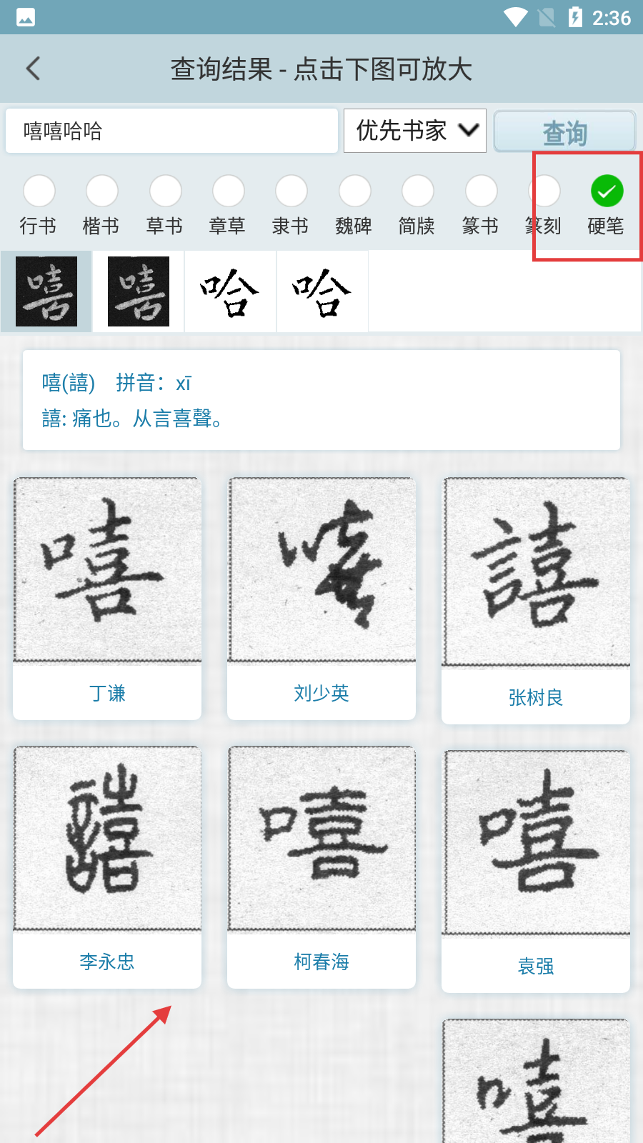 把書體切換成【硬筆】,就能看到這個漢字在硬筆書法里的多種寫法,能滿足硬筆書法的學習需求。