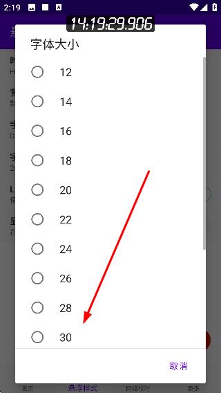 在懸浮樣式設置頁面點擊【字體大小】選項,即可打開字體大小的選擇彈窗。