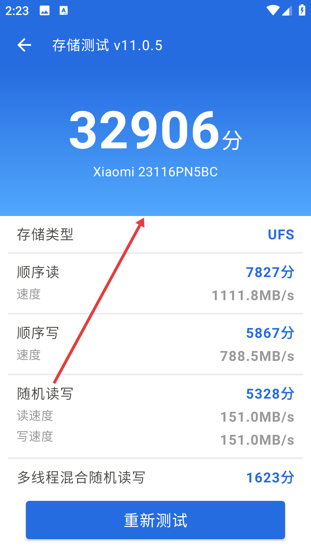 測試結束后,查看并存儲測試得分以及各項性能數據,比如順序讀、順序寫的速度等。
