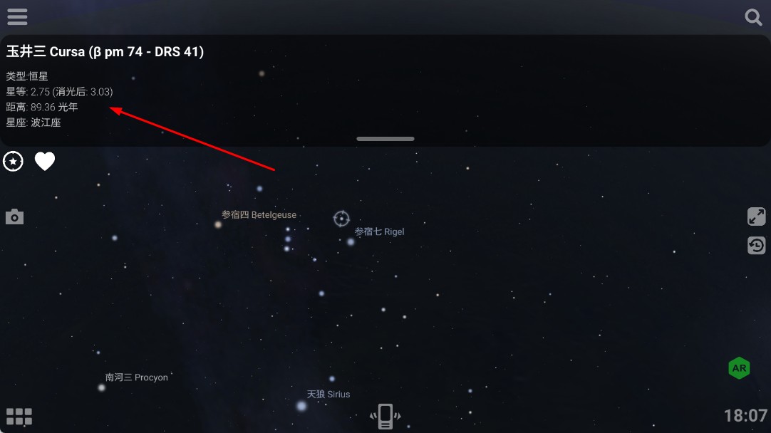 在星座模式下,能夠查看波江座這類星座以及與之相關的恒星信息,像參宿四、玉井三的星等、距離之類的數據都可以看到。