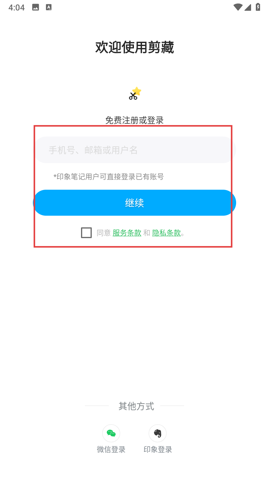 進入登錄頁面后,你可以輸入手機號、郵箱或者用戶名,勾選同意服務與隱私條款后點擊【繼續】按鈕;另外,也能選擇通過微信或印象賬號進行登錄。