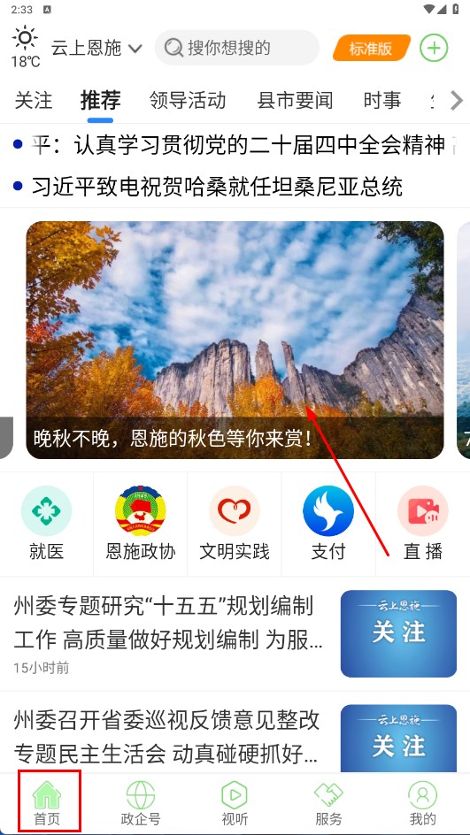 在首頁,你可以瀏覽恩施本地新聞,還能使用就醫(yī)板塊下的支付等服務(wù),同時(shí)也能查看恩施秋色的相關(guān)推薦內(nèi)容。