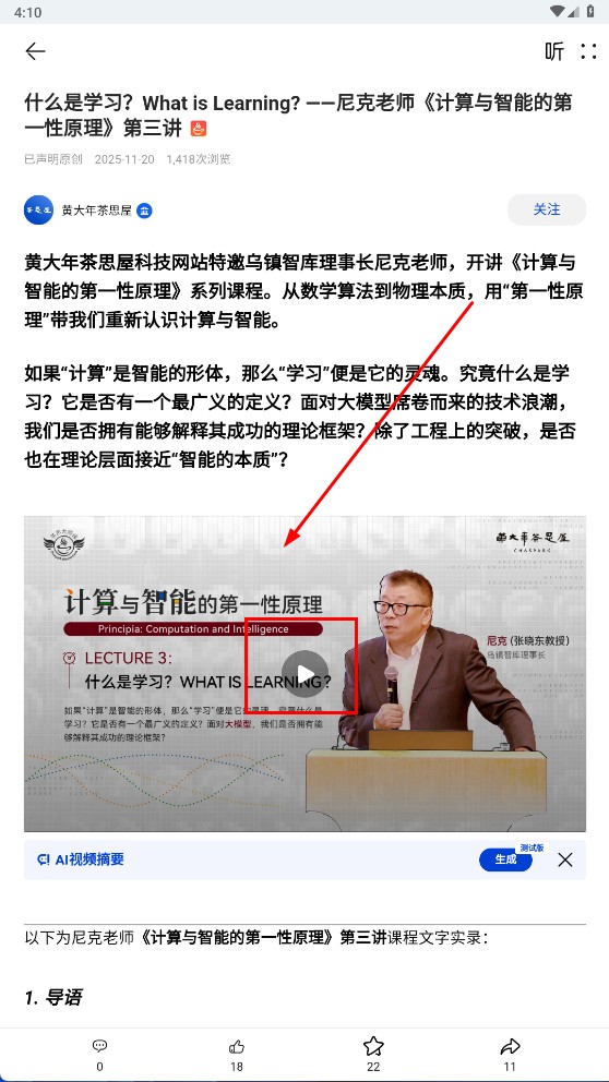 可以查看講座的文字實錄,深入理解【計算與智能的第一性原理】的核心觀點,并積極參與互動討論環節。