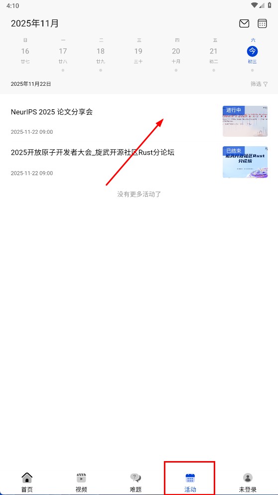 在活動頁面可以查看【NeurIPS2025論文分享會】之類的學術活動,并參與正在進行的會議。
