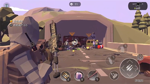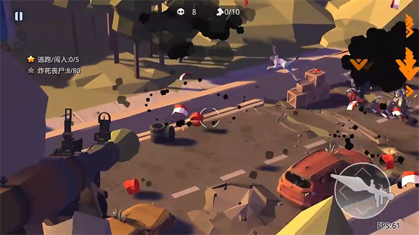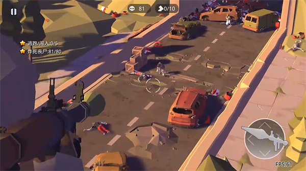 左側按鍵用于操控角色移動,右側按鍵則可讓角色持續使用武器發起攻擊,目標是消滅規定數量的僵尸。