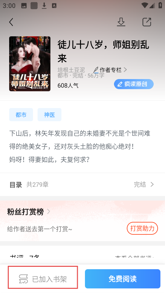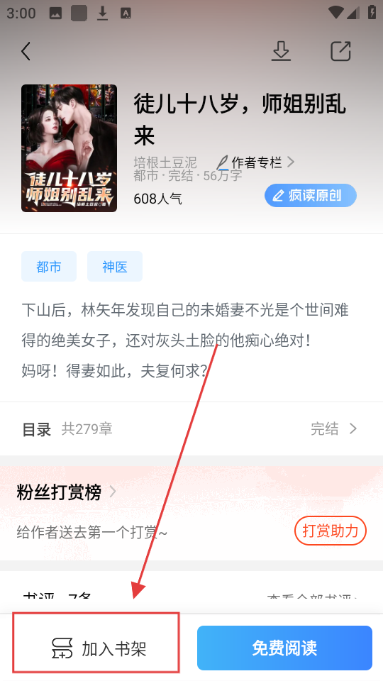 進入小說詳情頁后,點擊【加入書架】按鈕,就能把這本小說收藏好,這樣以后想再看的時候就方便多啦。