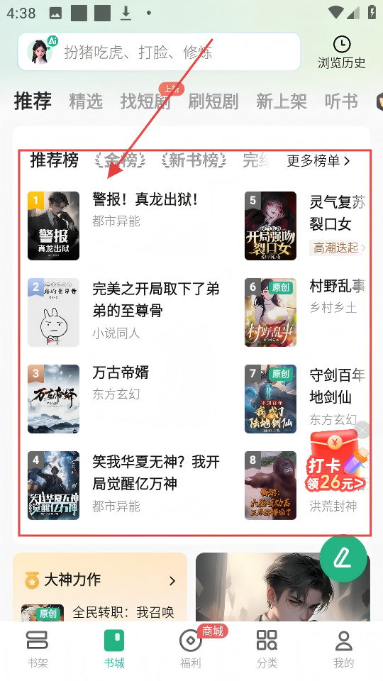 書城推薦榜上有不少熱門小說,要是看到感興趣的,點一下就能進到詳情頁,體驗很不錯。