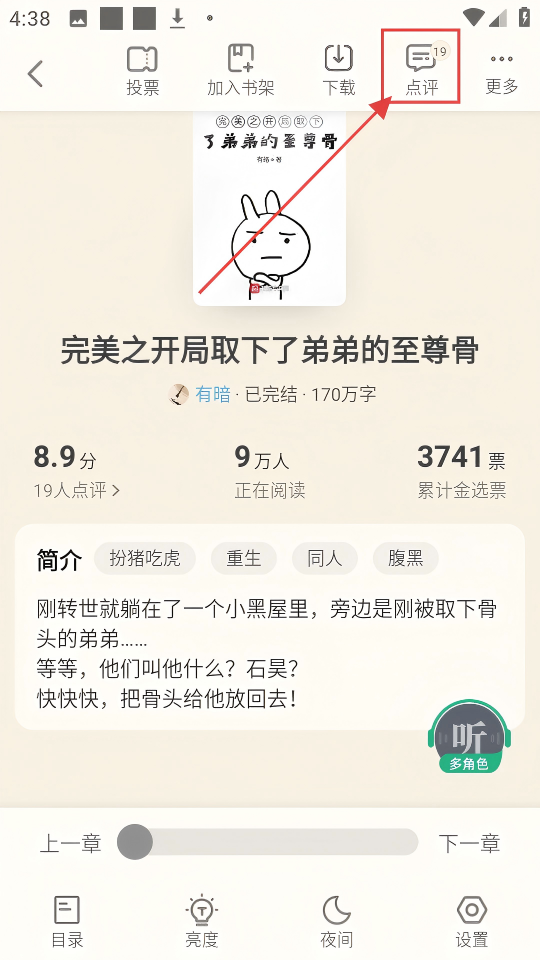 在小說詳情頁面,點擊【點評】按鈕,就可以查看其他讀者的評價,輕松了解這部小說的口碑情況。