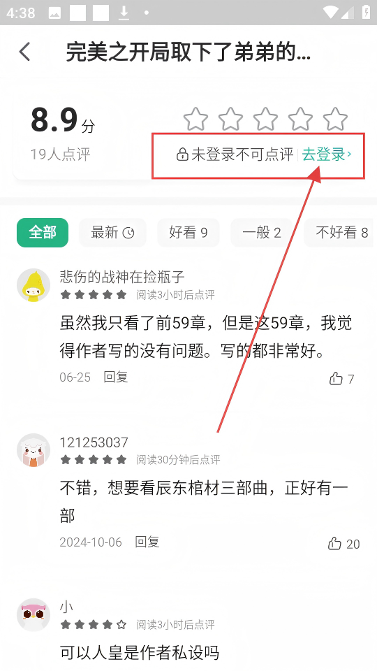 要是想對小說進行點評,看到【未登錄不可點評-去登錄】的提示后,點擊“去登錄”按鈕,就可以參與點評了。
