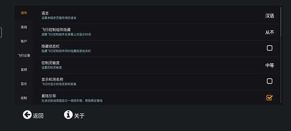 在模擬器界面中,視角調整功能由特定指令控制;菜單區域內,某個選項用于完成著陸后的重新起飛操作,另有選項可返回飛行操控界面,還有一個選項能直接跳轉至主界面。