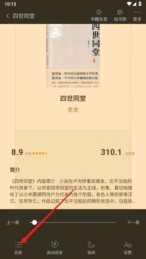 進(jìn)入閱讀界面后,輕點(diǎn)屏幕中間區(qū)域即可調(diào)出菜單,隨后選擇“目錄”選項(xiàng)。