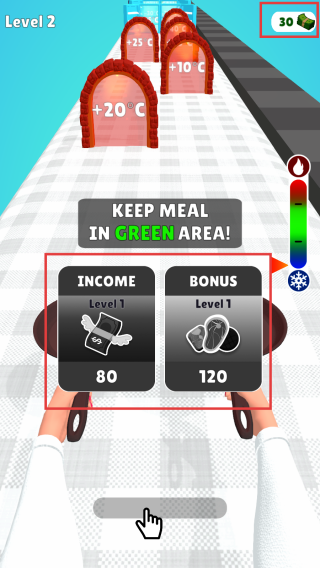 在跑酷過程中,我們要把食物的火候控制在右側溫度條的綠色區域,通過點擊屏幕讓角色左右交換食物,借助穿過火爐或冰柜的方式來調整溫度。