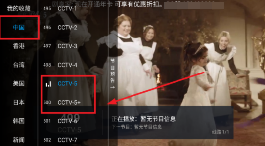 選擇國內的CCTV5或CCTV5+點擊進入。