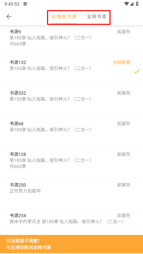 如圖所示,這里包含了AI智能書源和全網書源,你只需選擇并點擊想要的書源,就能完成切換。