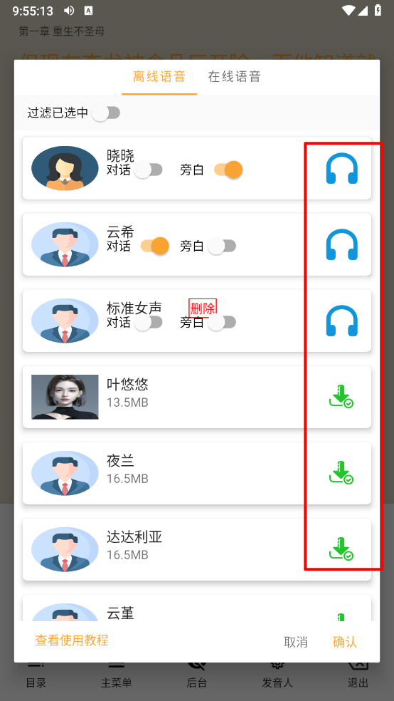 點擊發音人右側的耳機圖標,即可試聽該發音人的語音##對話/旁白的含義是什么