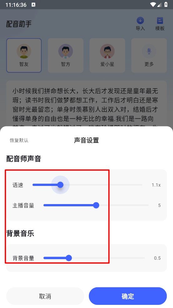 接著進入聲音設置界面,挑選語速、主播音量和背景音量的參數,最后點擊“確定”按鈕。