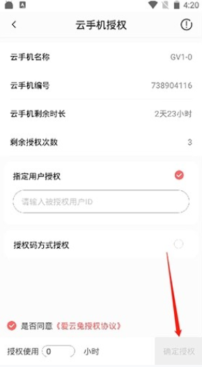 接下來在云手機的授權頁面,輸入用戶ID后,點擊“確定授權”按鈕就可以了。