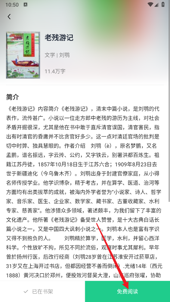 進(jìn)入小說詳情頁,點擊"免費閱讀"。