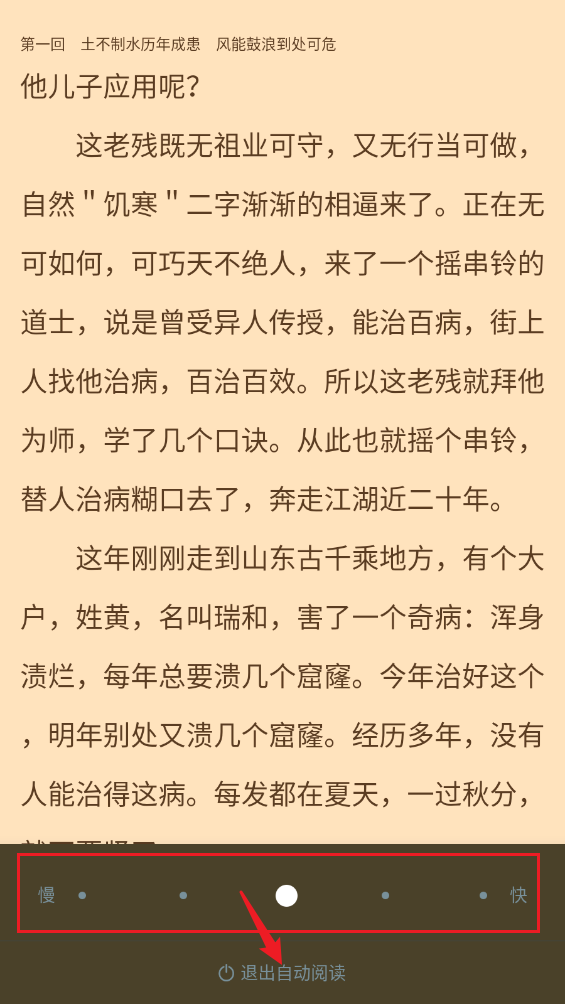 如圖所示,自動閱讀功能已成功開啟,您可以根據(jù)需要調(diào)節(jié)閱讀速度。若要退出自動閱讀,點擊底部的相應(yīng)按鈕即可。