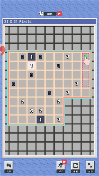 進入游戲后,系統會自動把圖片劃分成不同區域,你需要根據區域內的數字,用尺寸各異的矩形把所有區域都填滿。