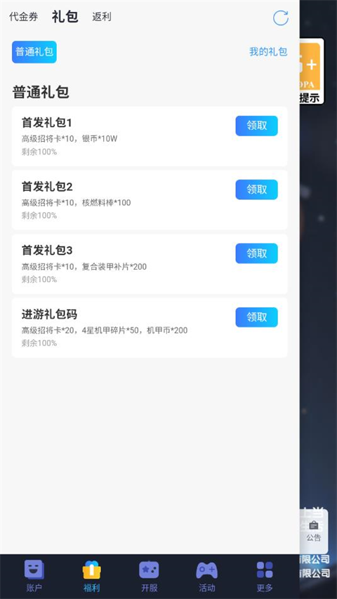 登錄游戲后,點擊首頁的懸浮球,進入禮包領取頁面并點擊領取按鈕。