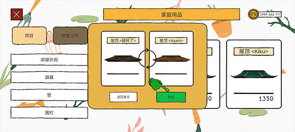 點擊“修復工作”選項,選擇家庭用品類別,然后挑選并購買你喜歡的屋頂樣式。